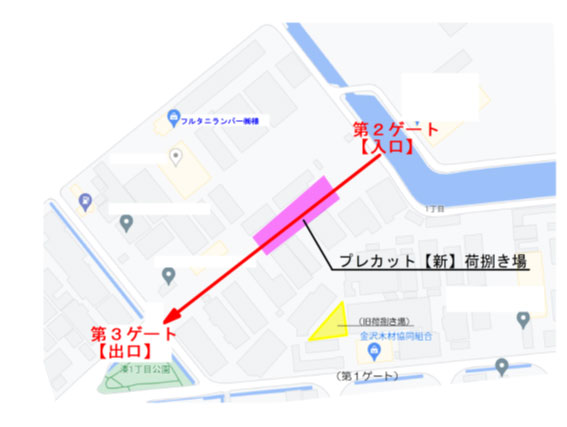 新ゲート(第2・第3ゲート)の設置により構内へ進入するトラックが分散され、正門前の渋滞が緩和されるようになります。また、新たな運用として『プレカット完成品の格納と搬出』が変更となり、安全で正確な搬出が出来る様になります。